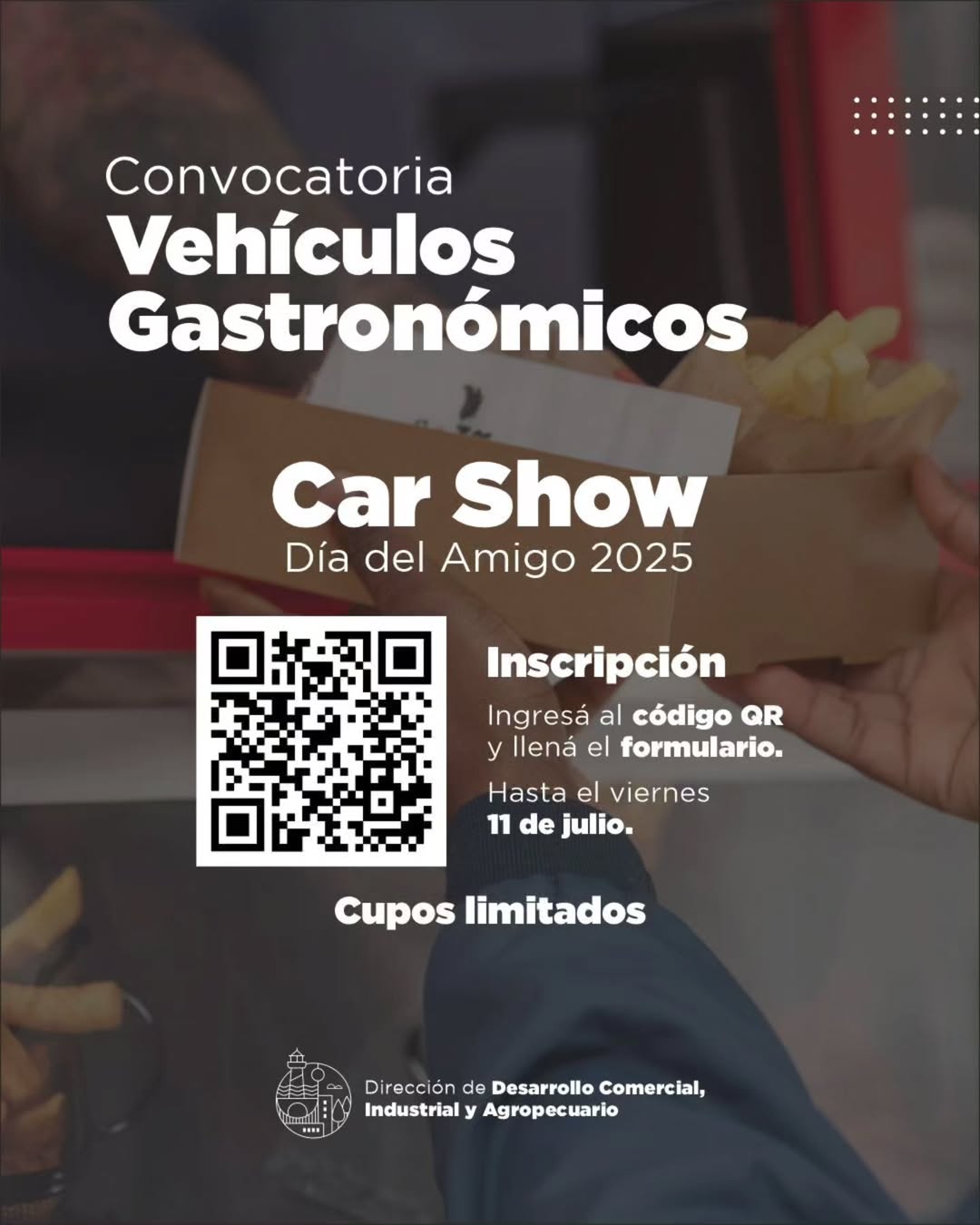 La Dirección de Desarrollo Industrial, Comercial y Agropecuario del municipio, informa que se mantiene abierta la convocatoria a vehículos gastronómicos para participar del Car Show que se realizará en la ciudad el Día del Amigo.